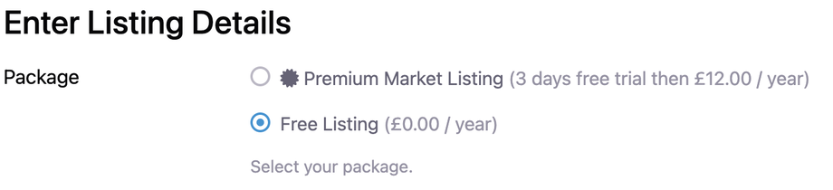 When you begin to add your listing, it will ask you which 'PACKAGE' you would like to use for this market listing.