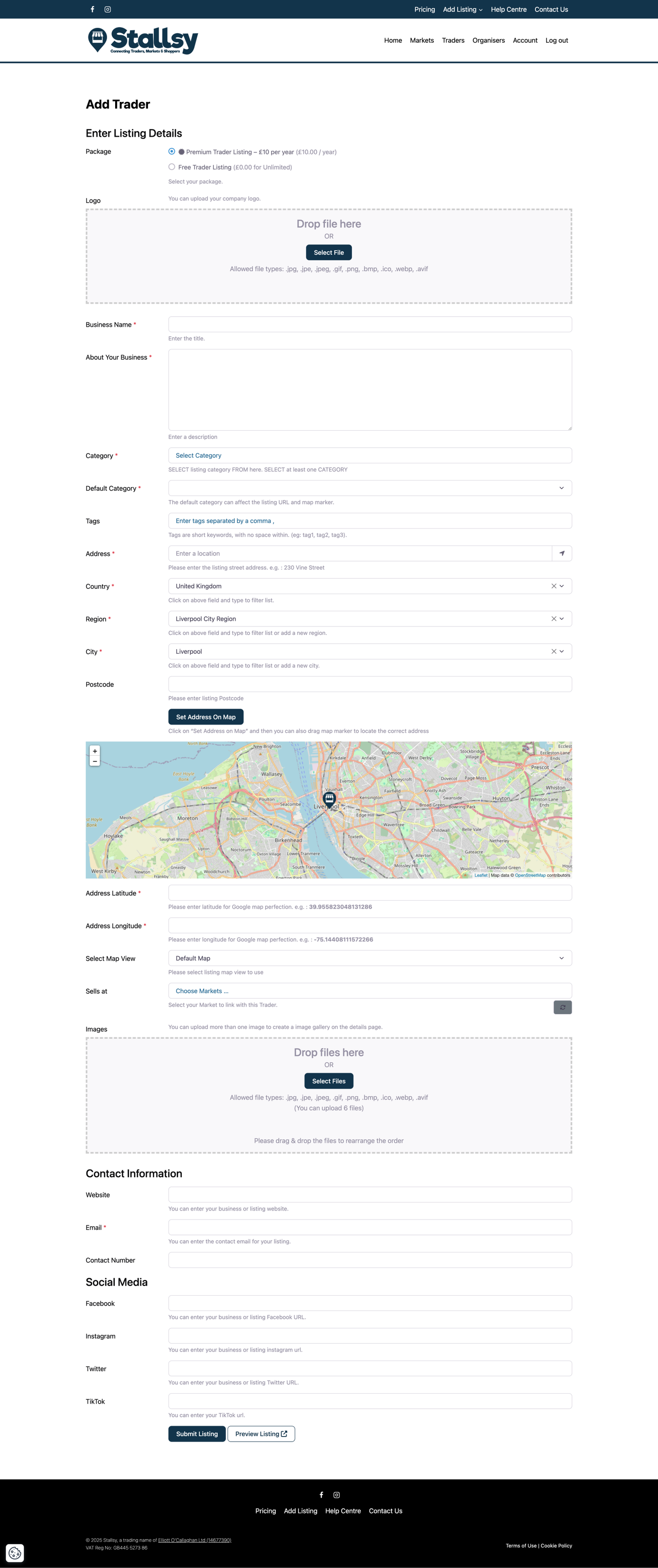 Once you have logged in, you will see the 'ADD TRADER' page where you can enter all your details, upload your logo and images etc.